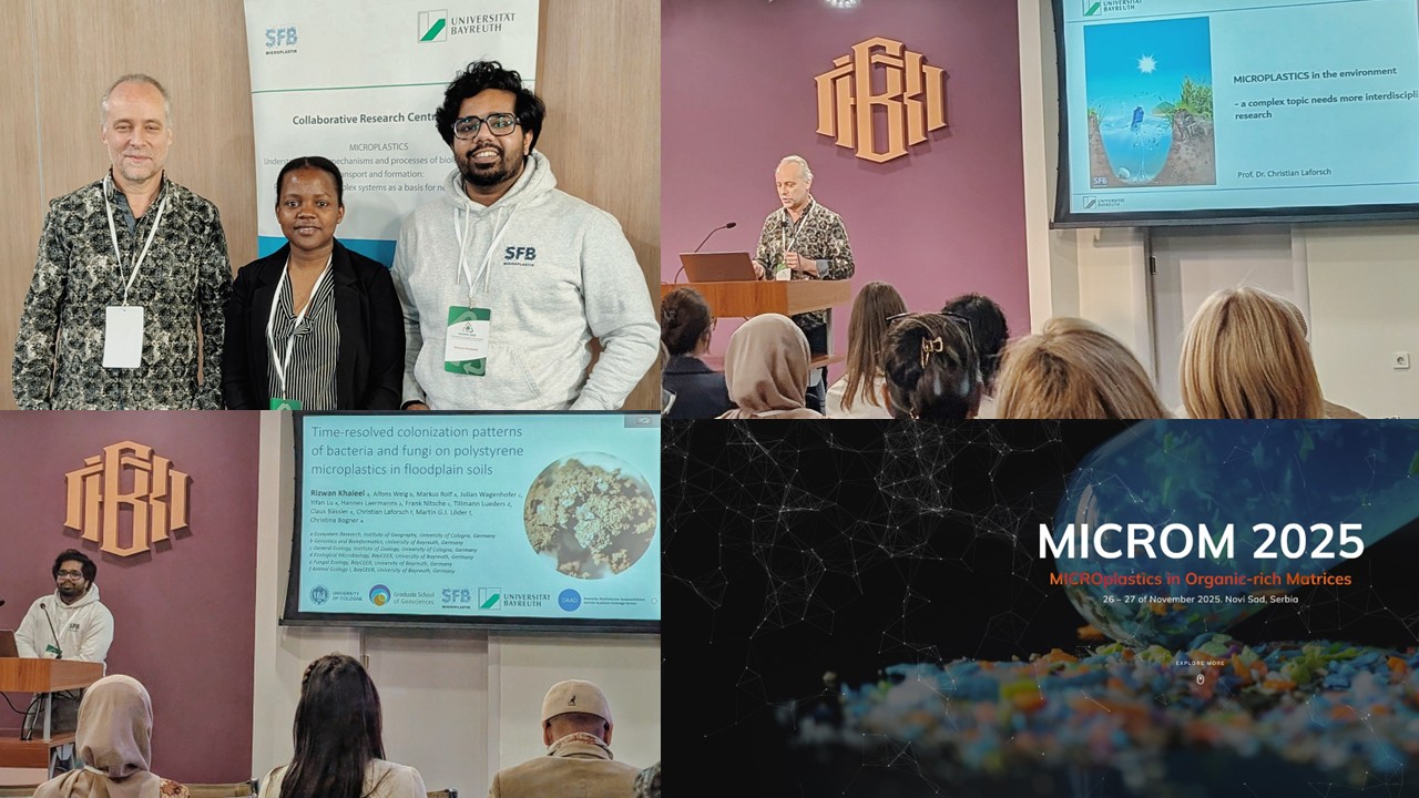 Prof. Dr. Laforsch, Diana Nantege and Rizwan Khaleel are attending the MICROM 2025 conference in Novi Sad, Serbia. Prof. Laforsch was a keynote speaker and Rizwan Khaleel gave a presentation on the current investigation of the colonization of microplastics in floodplain soils by bacteria and fungi.